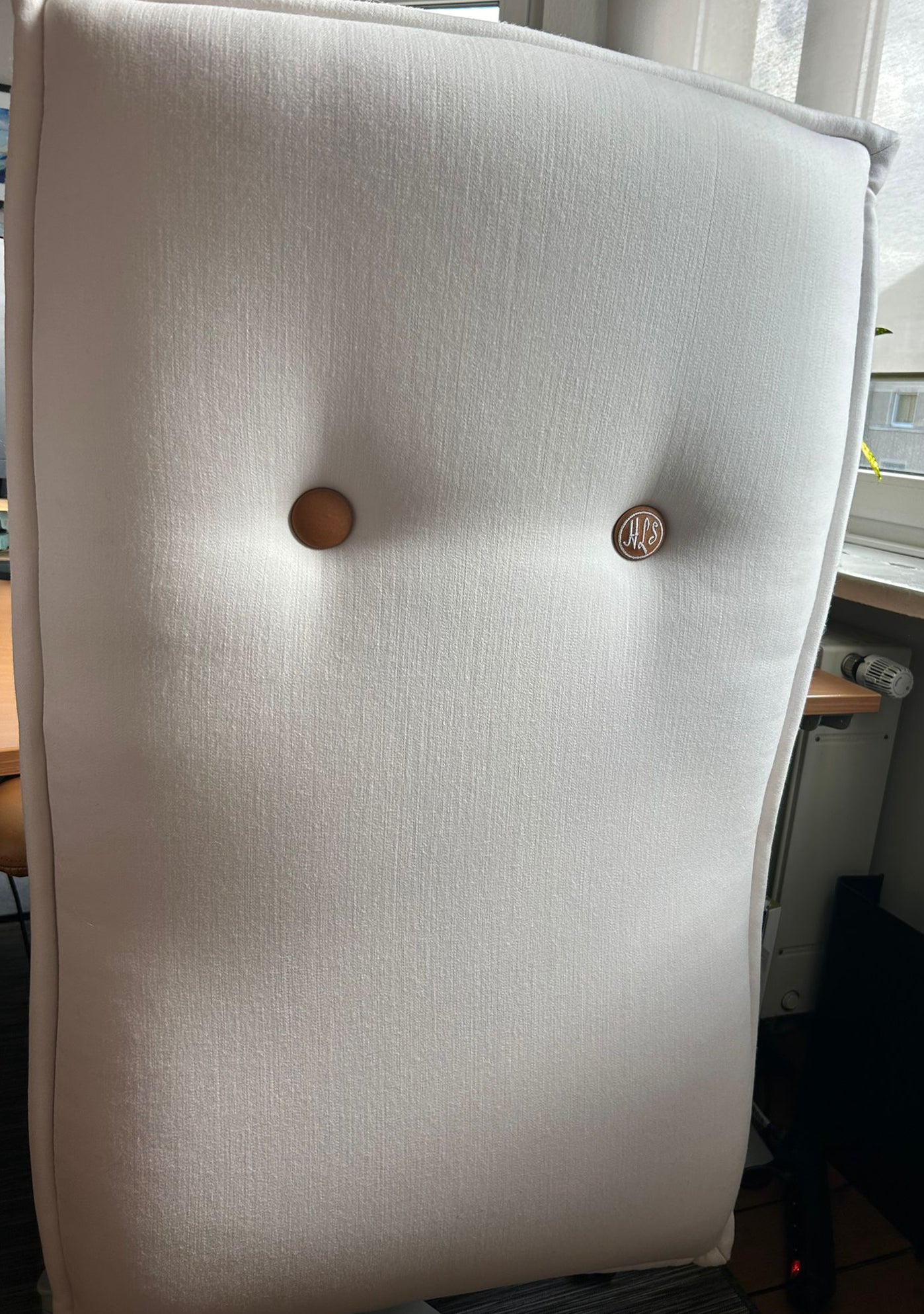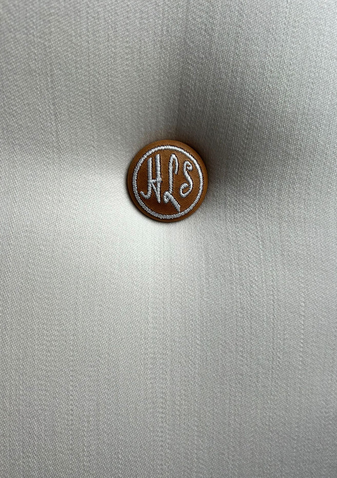 Unser maßgeschneiderter Brasilian Chair hebt sich durch ein besonderes Detail hervor: die Monogramm-Stickereien an den Knöpfen.