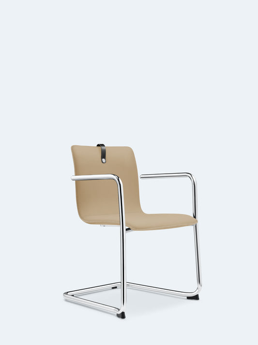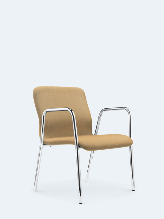 The Moonraker with armrests, designed by Fritz Močnik, is an elegant, stackable chair that blends seamlessly into any environment. It stacks up to ten chairs high, features distinctive backrest cut-outs for support, and a lightly padded seat for comfort. Available with or without armrests, it suits various needs. Its high-quality chrome frame ensures stability, while the plastic floor glides protect your flooring.