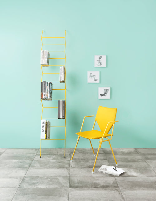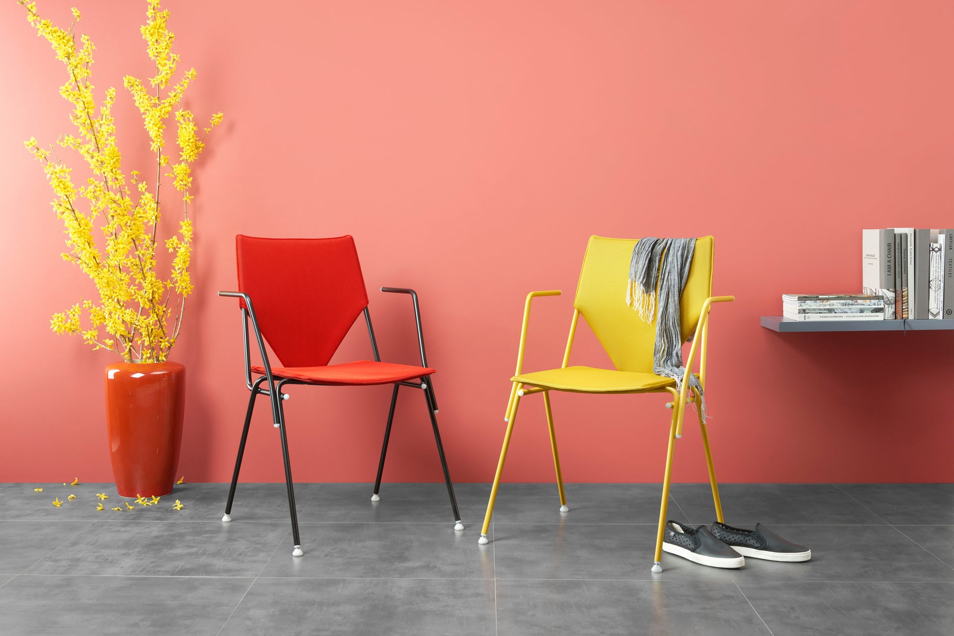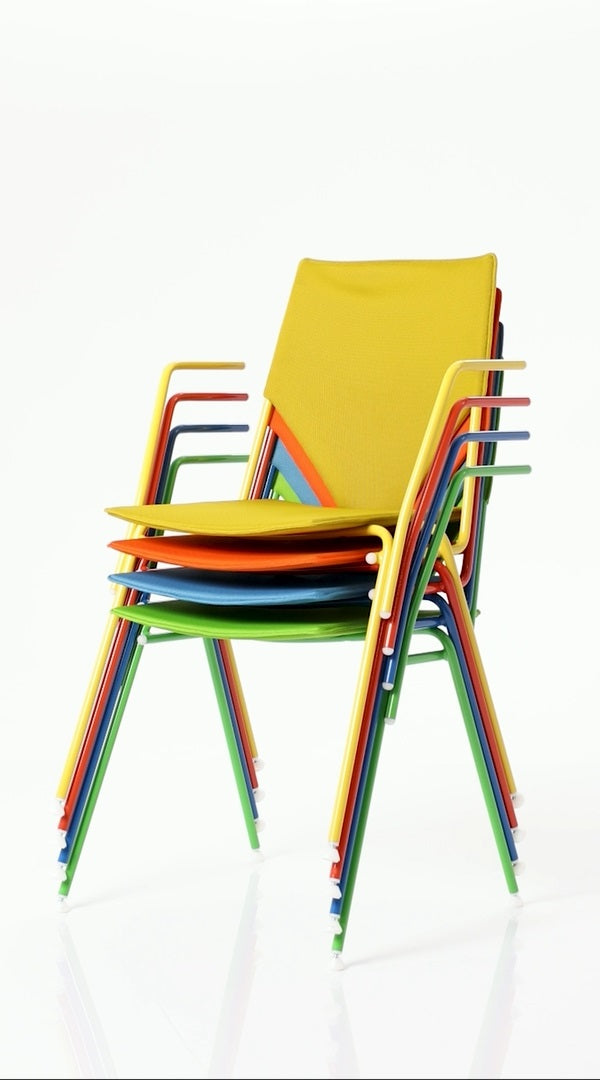 The Moonraker with armrests, designed by Fritz Močnik, is an elegant, stackable chair that blends seamlessly into any environment. It stacks up to ten chairs high, features distinctive backrest cut-outs for support, and a lightly padded seat for comfort. Available with or without armrests, it suits various needs. Its high-quality chrome frame ensures stability, while the plastic floor glides protect your flooring.